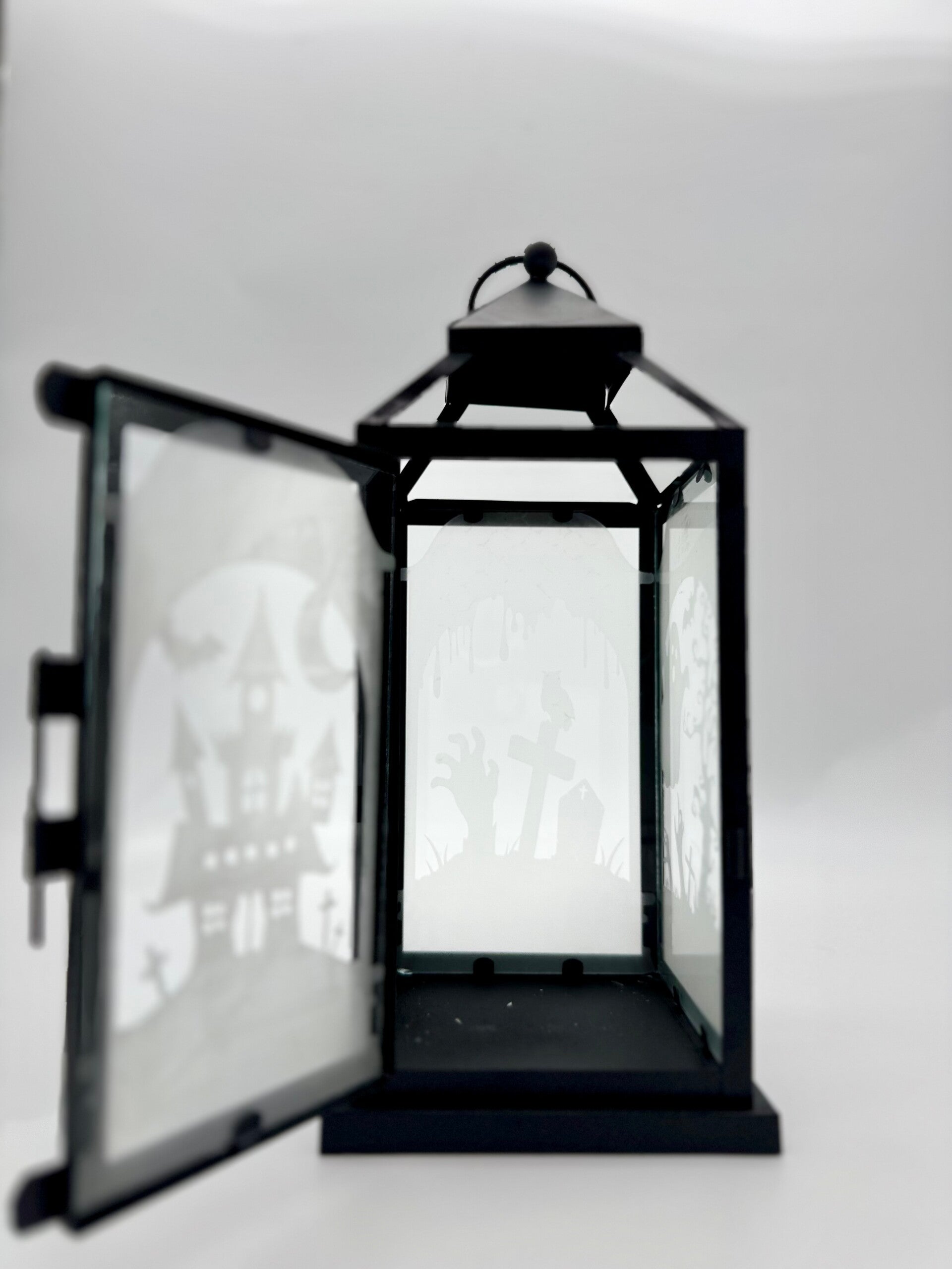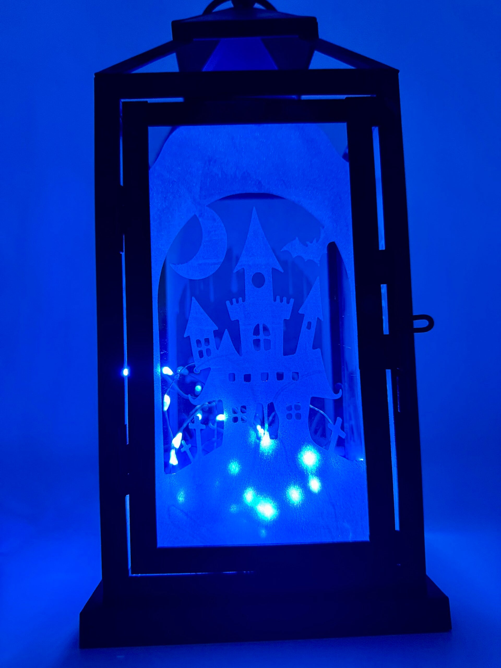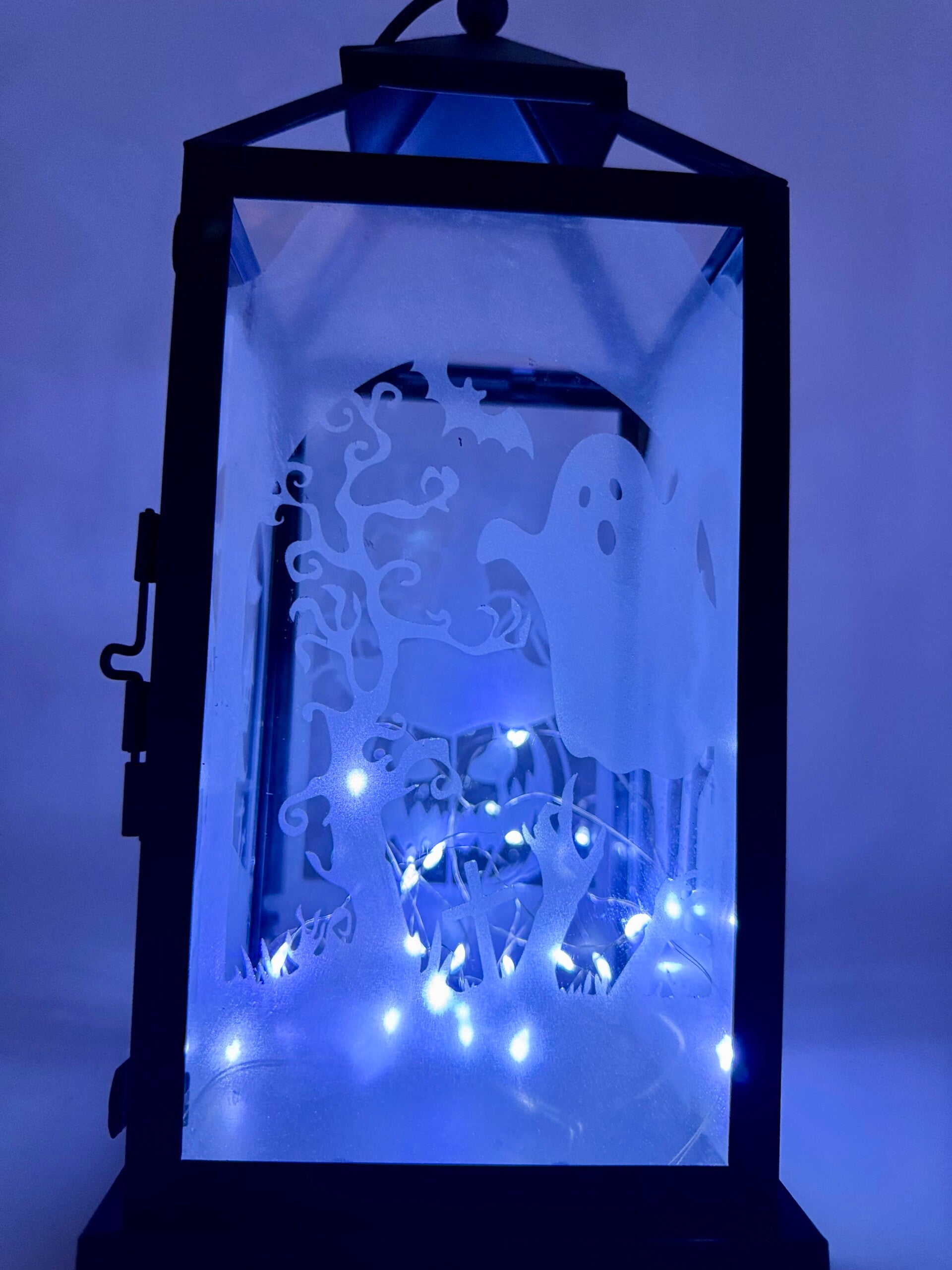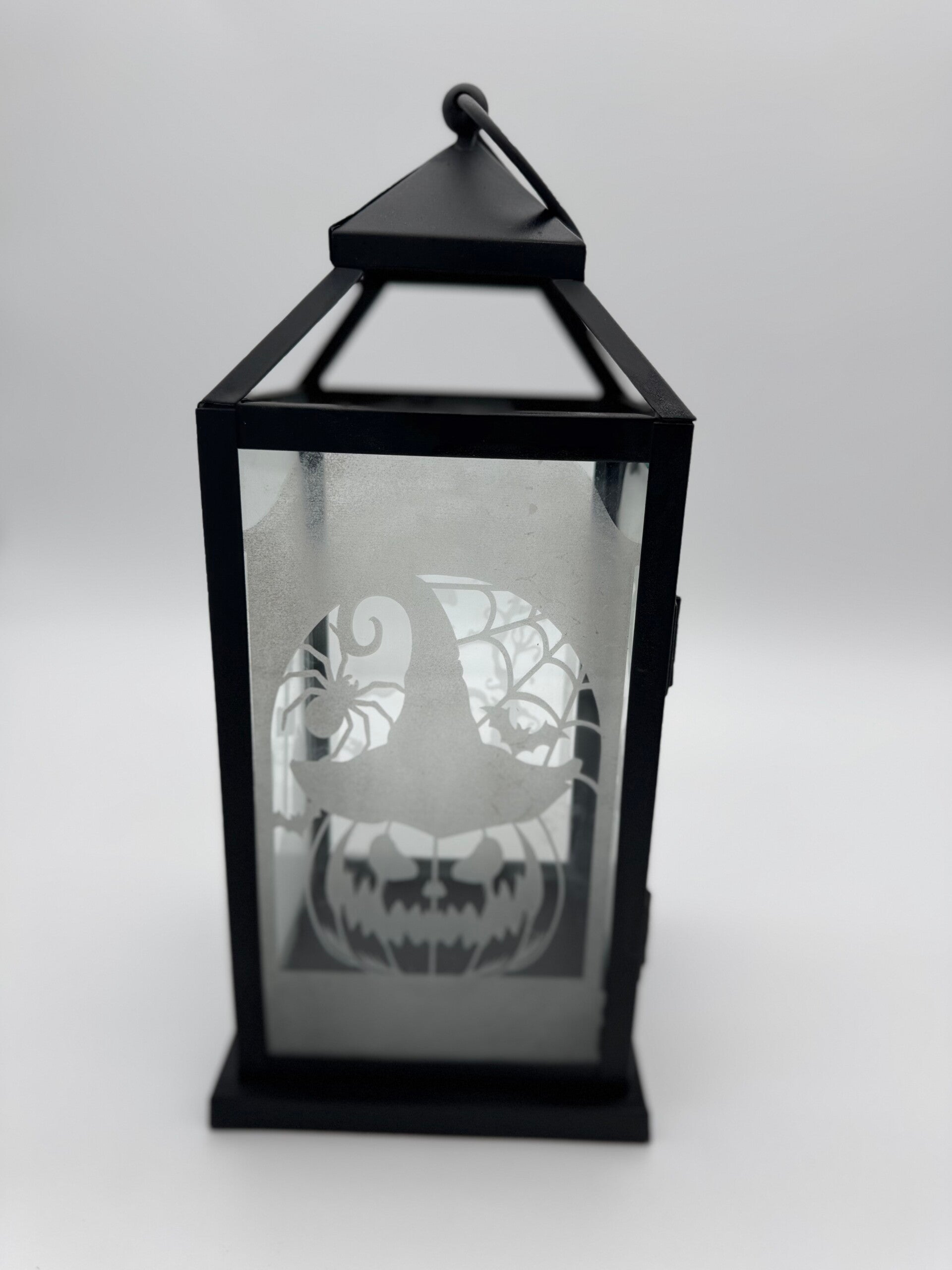 Decorate your home with this hand made Halloween Lamp. Metal Frame with Glass Panels. 1 string of fairy lights included. Recommend for indoor or covered outdoor spaces.
